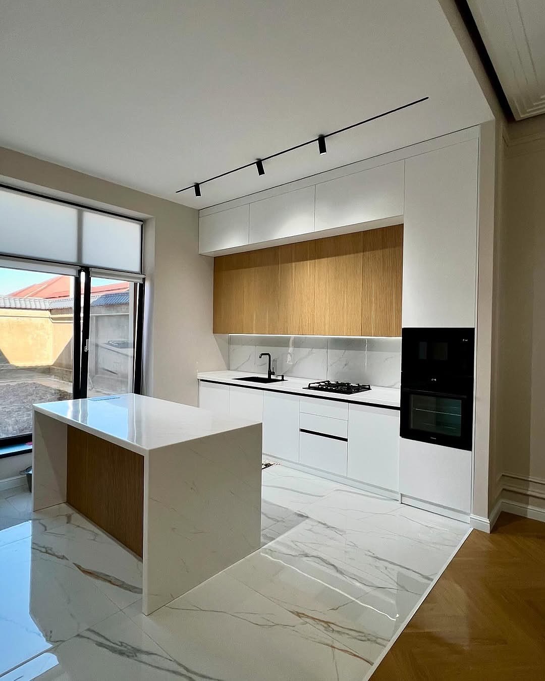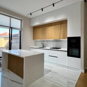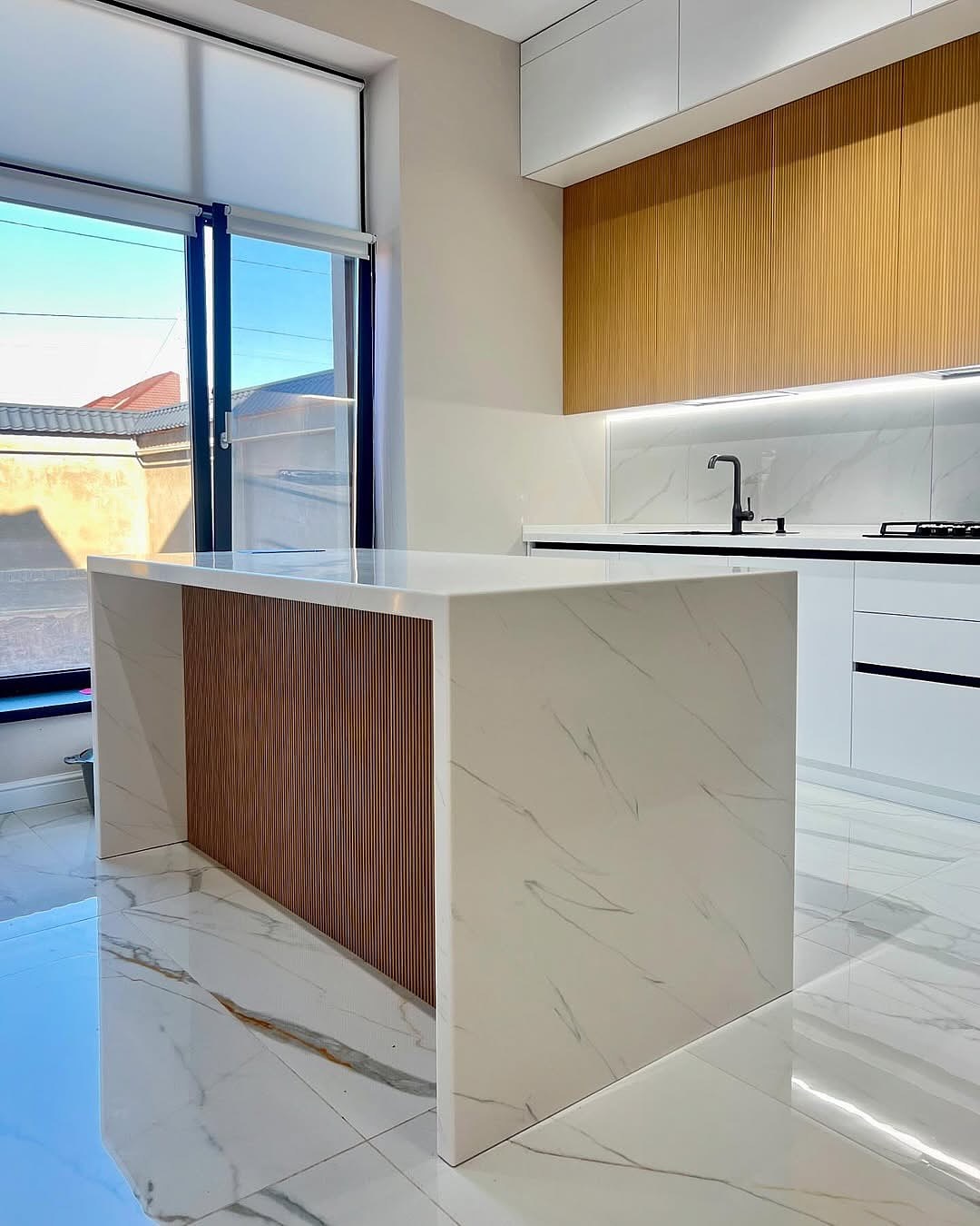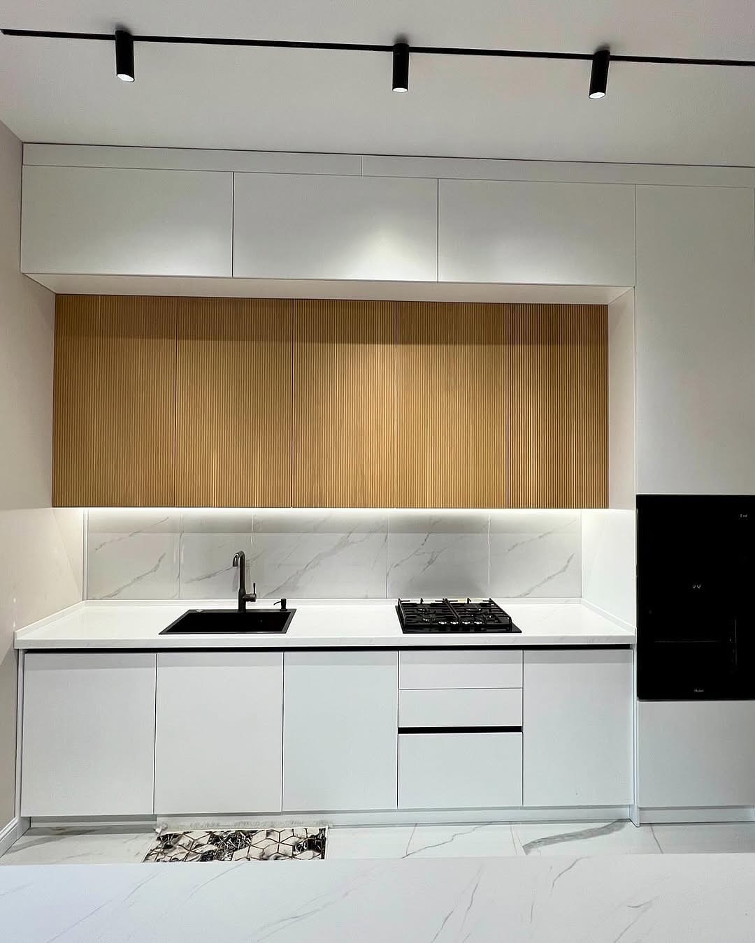 - Điểm nhấn sang trọng: Từng đường nét được gia công tỉ mỉ, tạo chiều sâu cho không gian bếp hiện đại.